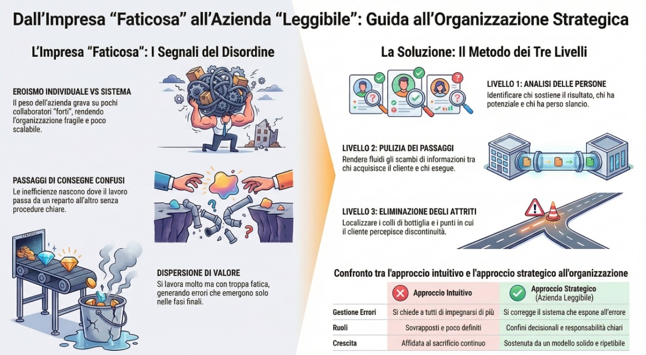 Un’impresa leggibile è un’impresa in cui è chiaro chi fa cosa, chi decide cosa, quando un passaggio è completo, dove si controlla la qualità, dove nasce un errore, come si previene la ripetizione dello stesso problema. È un’impresa in cui i ruoli non si sovrappongono inutilmente e in cui il lavoro non dipende solo dall’eroismo quotidiano di pochi.
