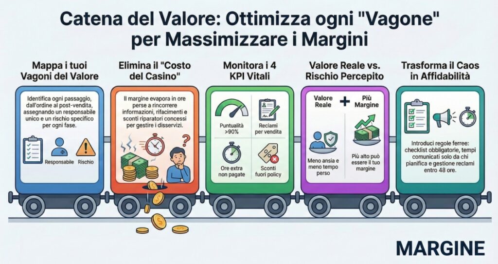 Non è un problema di volontà. È un problema di macchina: la macchina che trasforma tempo, competenze e costi in un’esperienza cliente. Quella macchina si chiama catena del valore. E quel giorno, l’obiettivo è uno: renderla visibile, misurabile, migliorabile.